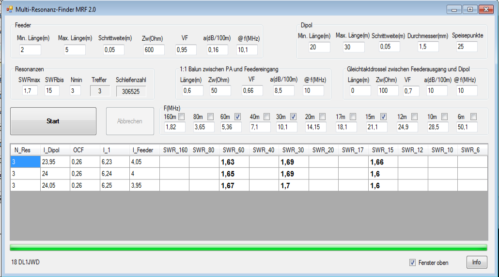 I haven’t build one of those, but from my experience when i built the ZS6BKW and the OCF-dipole for 60 and 30m, I’m very confident it will work. Efficiency 90%+ on 2 out of 3 bands, still good on 30m , no tuner in use. Below you see the results calculated by the Multi-Resonannce-Finder.