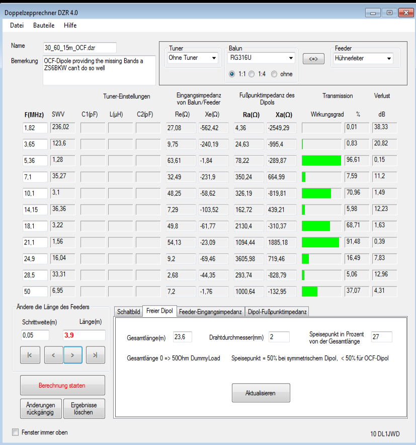I haven’t build one of those, but from my experience when i built the ZS6BKW and the OCF-dipole for 60 and 30m, I’m very confident it will work. Efficiency 90%+ on 2 out of 3 bands, still good on 30m , no tuner in use. Below you see the results calculated by the Multi-Resonannce-Finder.